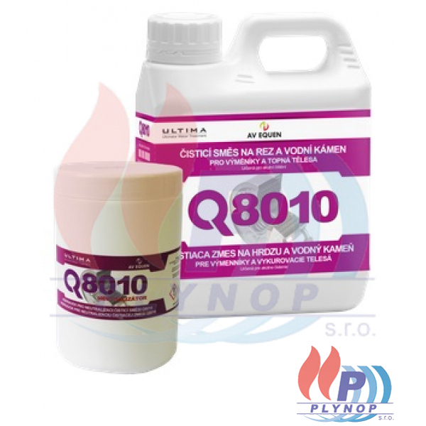 Přípravek nařeďte vodou na požadovanou koncentraci 5–10 %, tj. 5–10 l Q8010 na 100 l vody (přípravek Q8010 nalijte do vody – v tomto pořadí!). Naředěnou čistící směs Q8010 aplikujte do systému a zajistěte neustálou cirkulaci po dobu 2–3 hodin. Při rozpouštění usazenin (především vápenatých) dochází k bouřlivé reakci a vývoji plynu, proto je nutné vždy zajistit odplynění čištěného zařízení po celou dobu cirkulace čisticího prostředku (optimální je použít cirkulační čerpadlo s otevřenou nádobou). Během rozpouštění vápenatých usazenin dochází k vyčerpávání kapacity výrobku, což se projevuje tím, že stoupá hodnota pH (cca na hodnotu 2,6) a ustává vývoj plynu. Pokud v systému ještě zůstávají usazeniny je třeba po vypuštění spotřebovaného roztoku použít roztok čerstvý. Po vyčištění systém vypusťte a řádně propláchněte vodou. Vypuštěnou směs zneutralizujte pomocí Q8010 neutralizátoru v nádobě mimo systém. Systém poté napusťte upravenou vodou (např. pomocí demineralizační jednotky AVDK 1000), aplikujte inhibiční směs řady Q100.